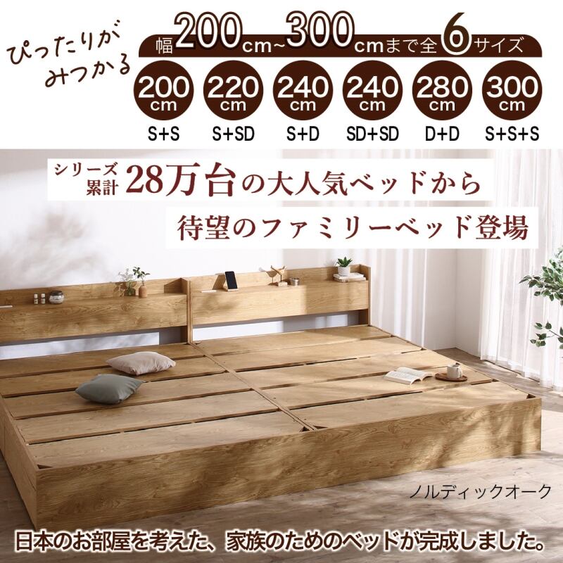 【フレームのみ WK280(D+D) お客様組立】棚コンセント付き 引き出し収納 天然木調連結ファミリーベッド Ever X family