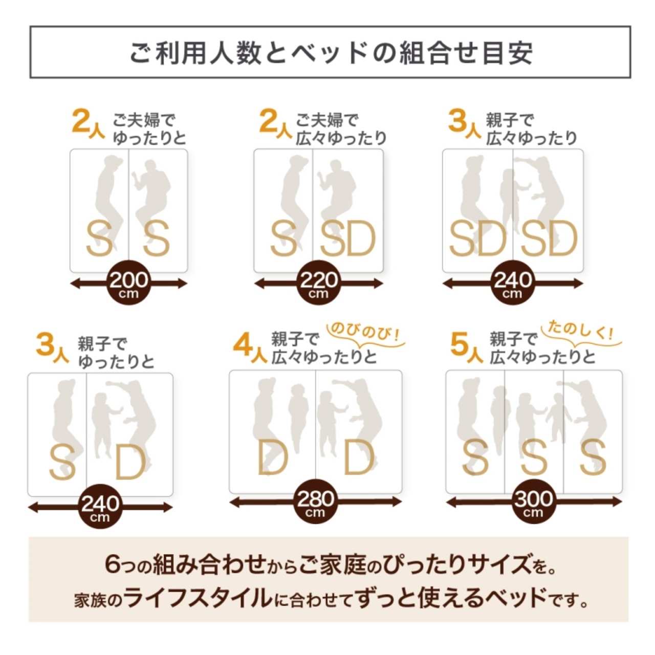 将来、誰がどれに寝る?を想像して選んでみましょう!また、DサイズはS,SDサイズより強度があり、耐荷重が大きく違うので、より耐荷重がほしい方には、S+Dがおすすめ。