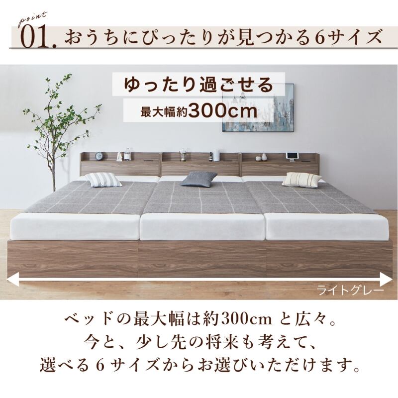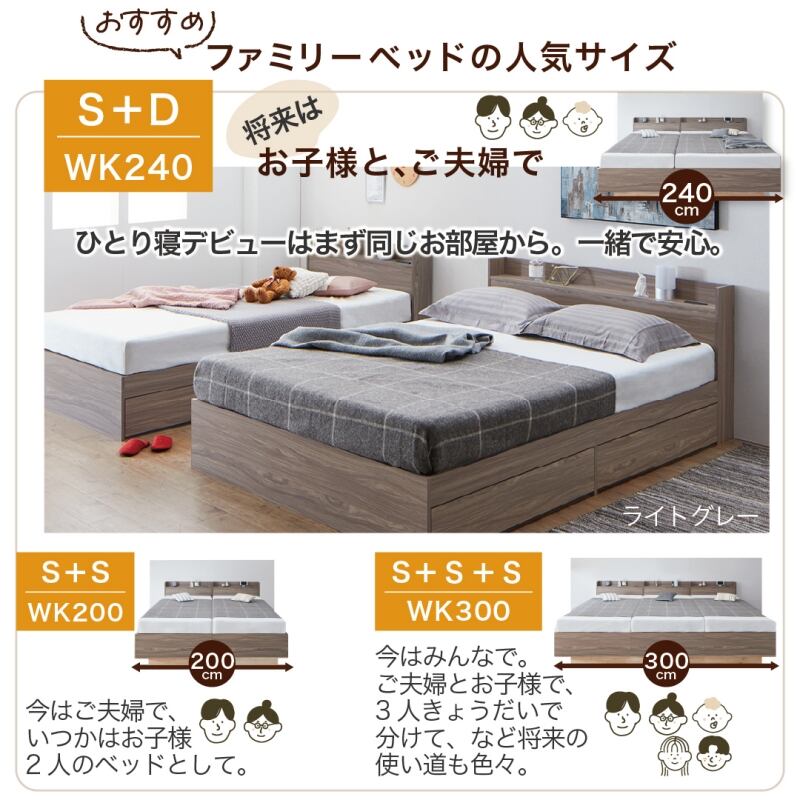 【ホテルプレミアムマットレス付 WK240(S+D) 組立設置サービス付き】棚コンセント付き 引き出し収納 天然木調連結ファミリーベッド Ever X family